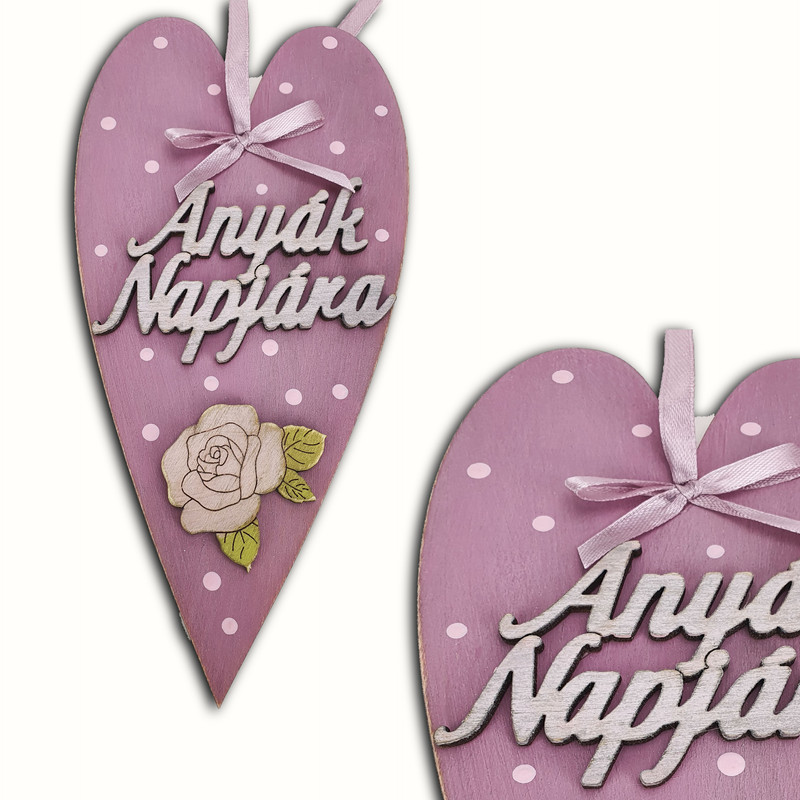 Anyák napja alkalmából ezzel az ajándékkal szeretnénk kifejezni az anyukák mindennapos törődését és szeretetét. Anyák napi díszített szív fából, felakasztható, "Anyák napjára" felirattal.