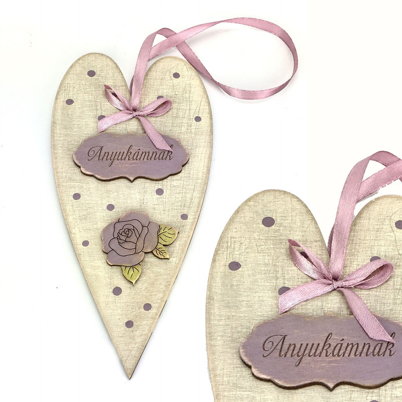 Anyák napi díszített szív fából, felakasztható, "Anyukámnak" felirattal.