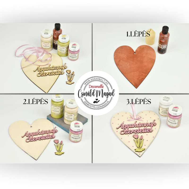 A fa szívet fesd le Decorolla lágy barack festékkel. A feliratot és a virágot is fesd le Decorolla lágy sárgászölddel és Decorolla mályva dekorfestékkel. Száradás után csiszold meg a felületeket.