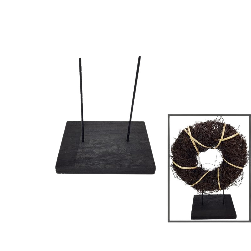 Fekete koszorútartó állvány, 2,5 cm vastag fa talapzattal. Állított koszorút eddig csak falon és ajtón lehetett elhelyezni, de ezzel az elemmel szekrényre, vagy asztalra is tehetjük a díszünket.