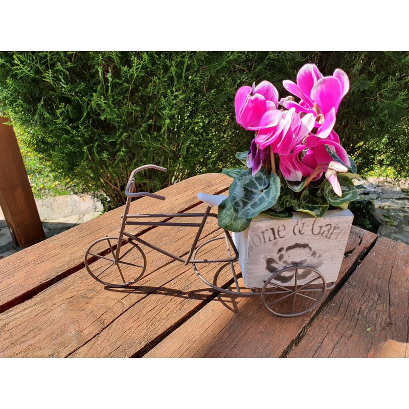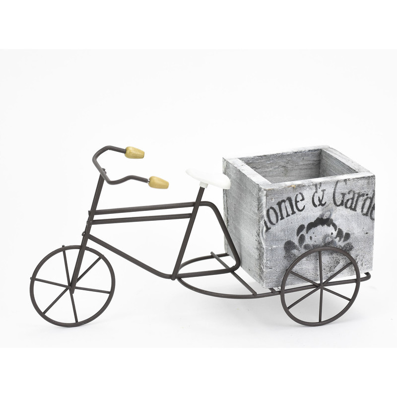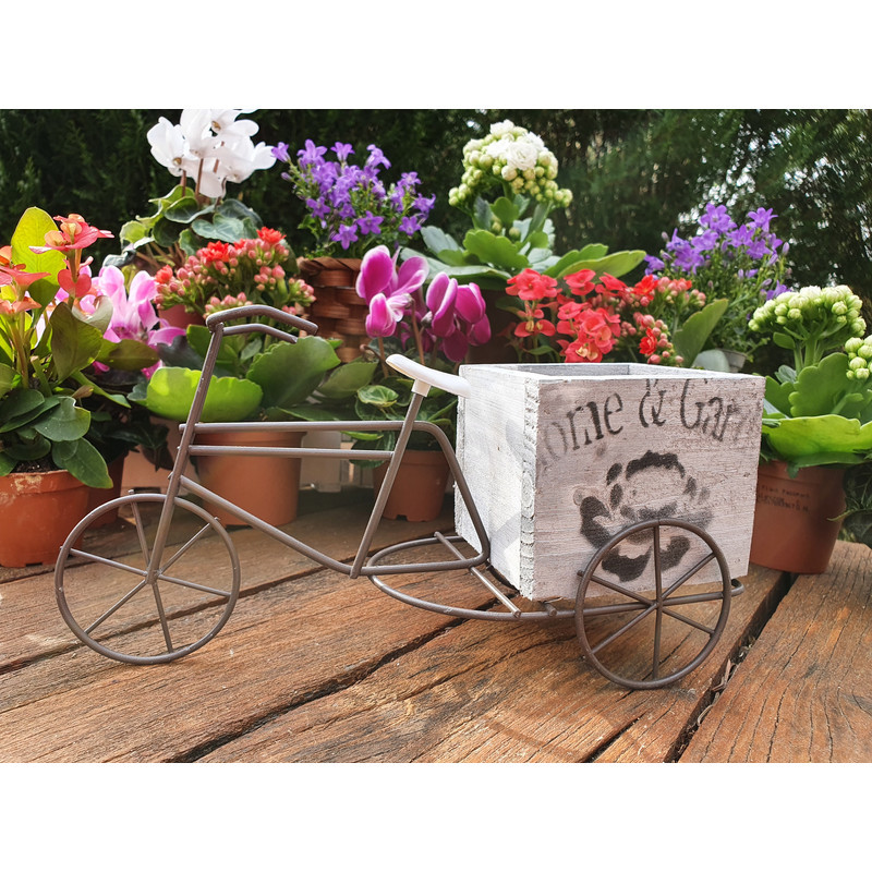 Virágtartó fém tricikli, fa kaspóval, kis méretű növényekhez. Kiváló ajándék lehet a biciklik illetve a virágok szerelmeseinek.
