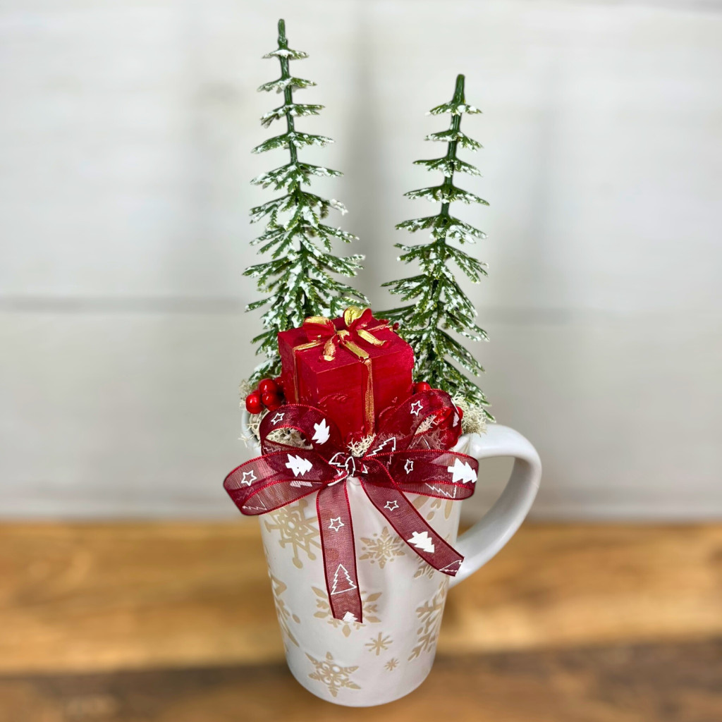 Ez a kész bögrés karácsonyi dekoráció olyan, mintha egy apró, csendes téli pillanat költözne be a lakásodba.
