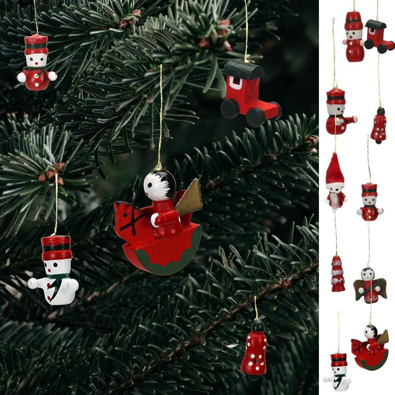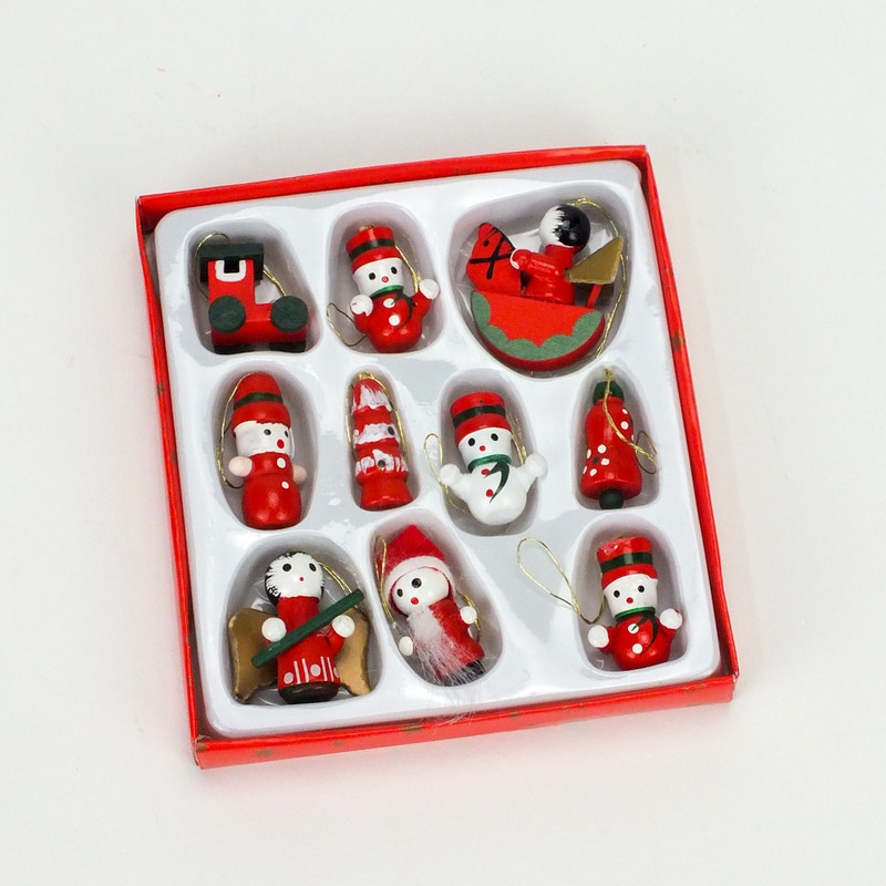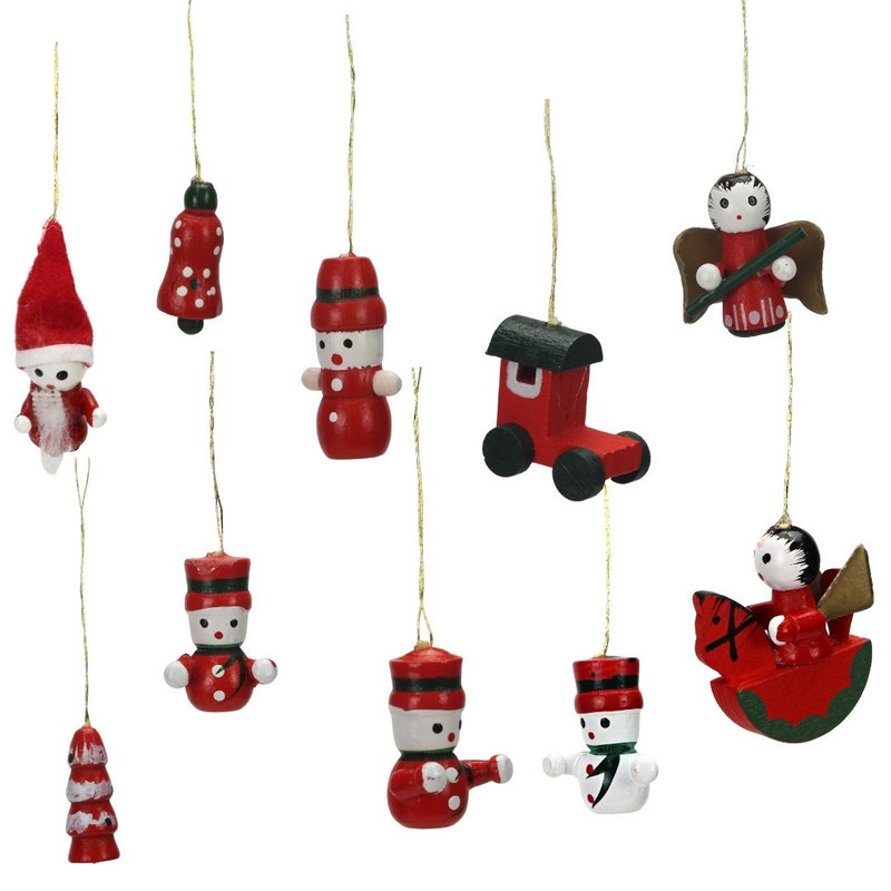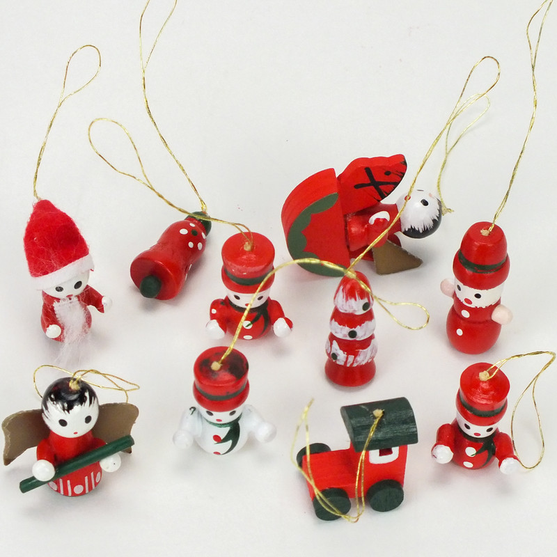 Fából készült mini karácsonyfadíszek. Akasztóval ellátott piros-zöld-fehér színű ünnepi témájú díszek.