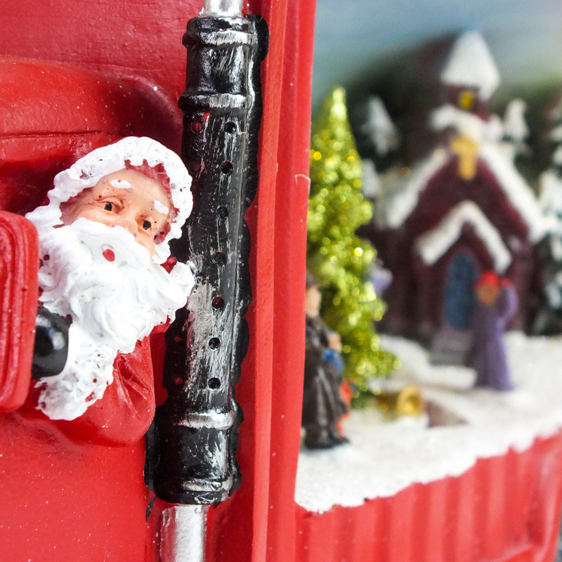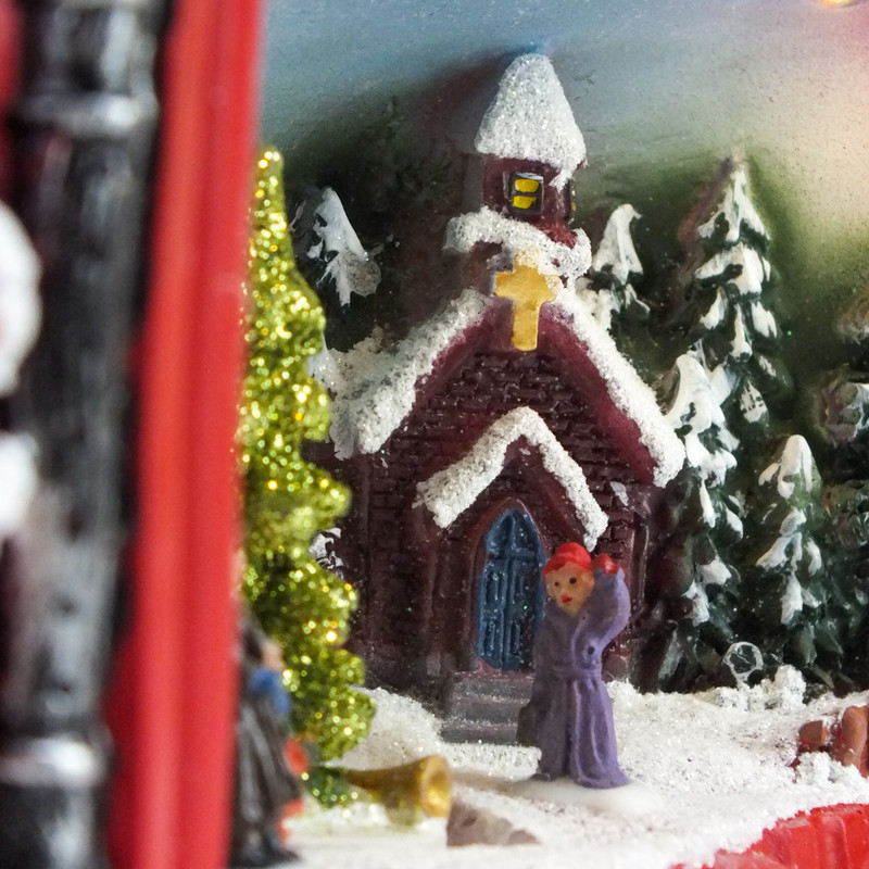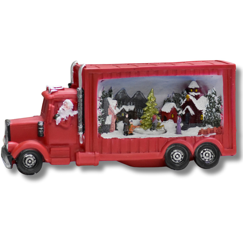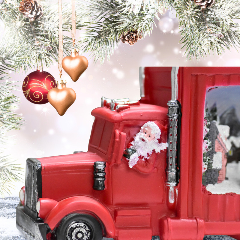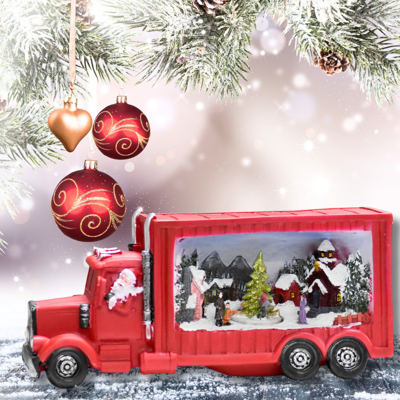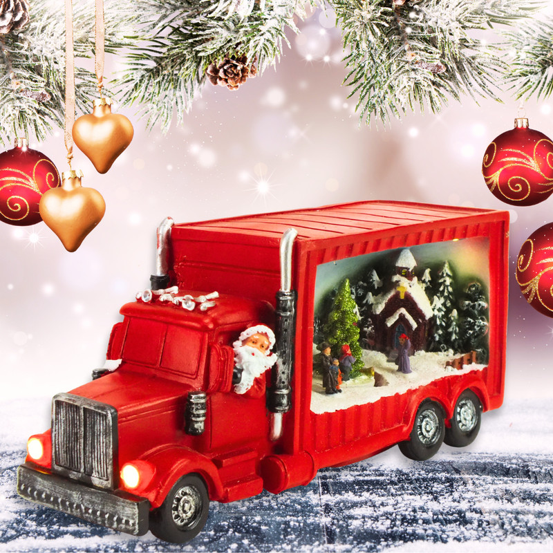 Igazán egyedi, ünnepi hangulatot hozó piros világítós kamion. A Mikulás kamionjának belsejébe bekukkantva egy kisváros makettje tárul eléd, házakkal, égbolttal, csillogó forgó fenyővel a közepén és a város lakóival. A részletesen kidolgozott jelenet fényszórókkal világított kamionnal és kivilágított belső kisvárossal még különlegesebbé teszi az ünnepi dekorációt.