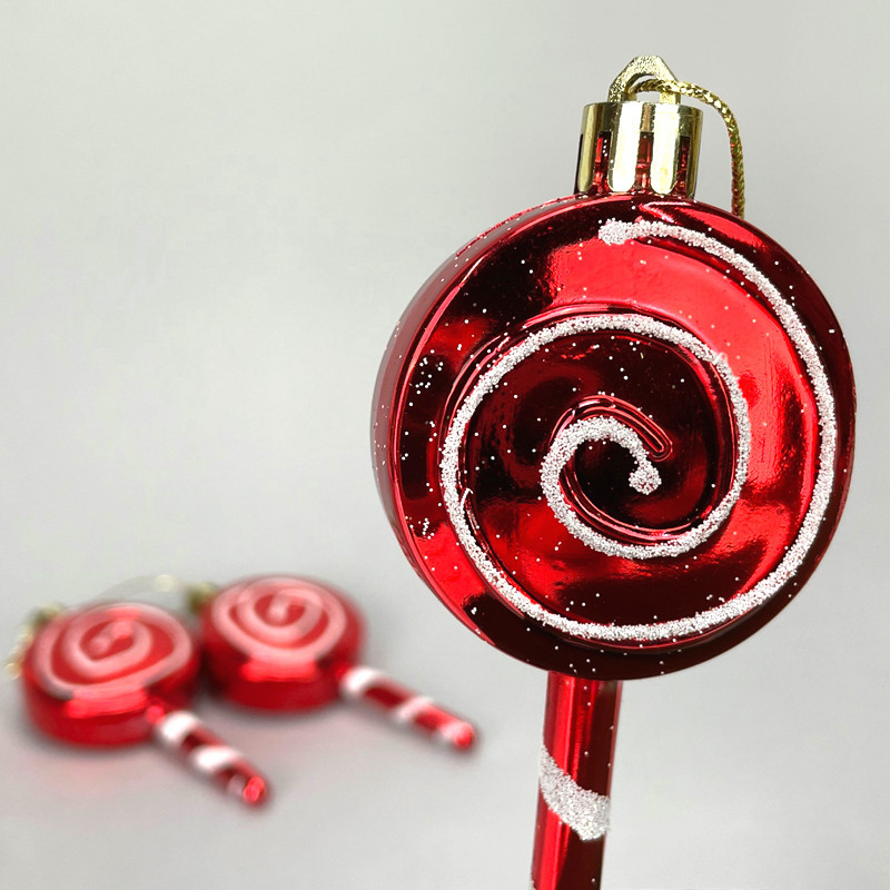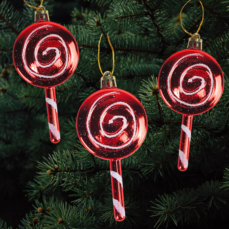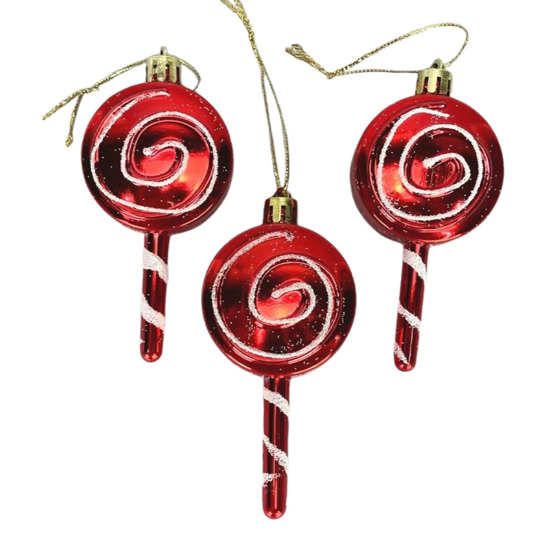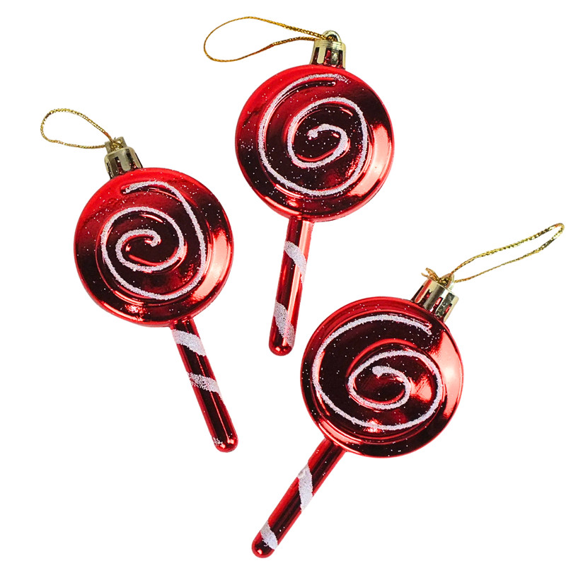 Csillámos karácsonyfadísz dekoráció: 3db kerek nyalóka dísz, akasztóval ellátva.