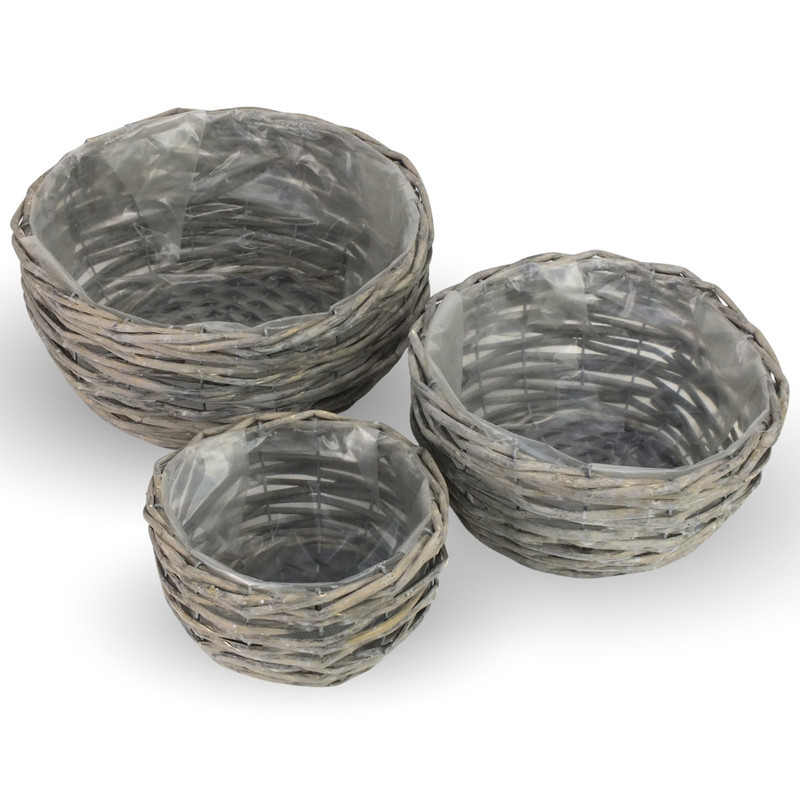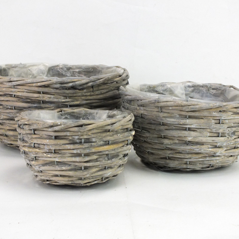 Dekoratív, természetes hatású fonott kaspó szett, amely három különböző méretű, fóliával bélelt kaspót tartalmaz. Tökéletes választás virágok, növények vagy dekorációs kompozíciók elhelyezéséhez. A bélés megvédi a fonott anyagot a nedvességtől, így élő növényekhez is használható.