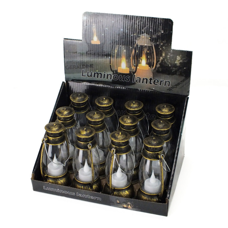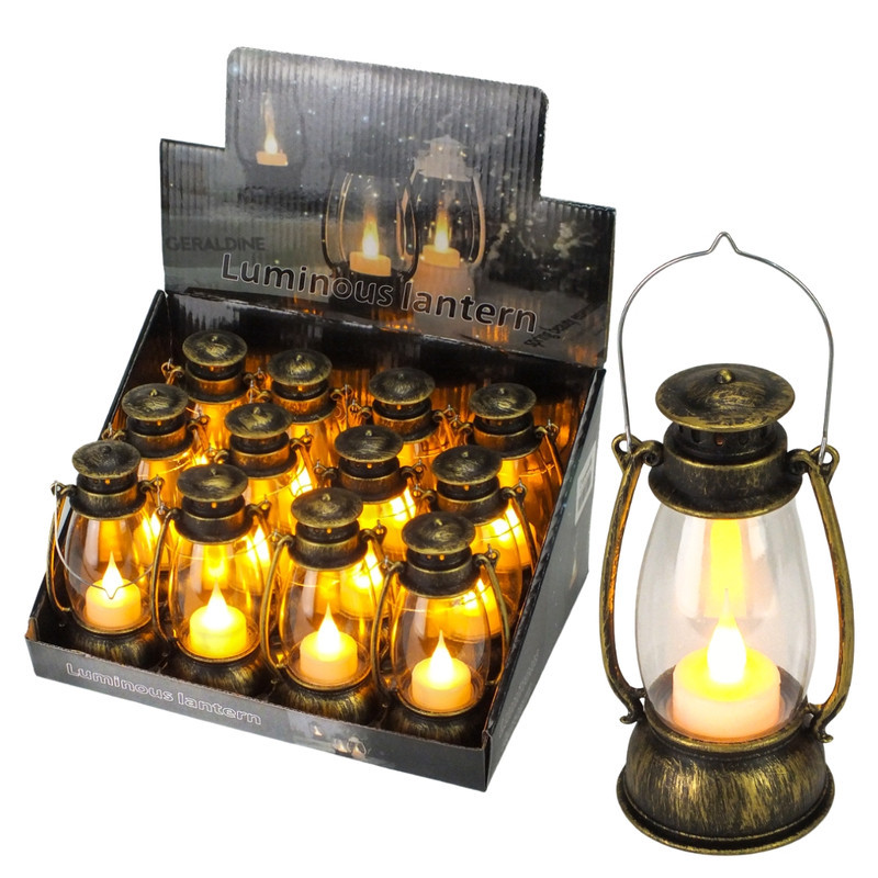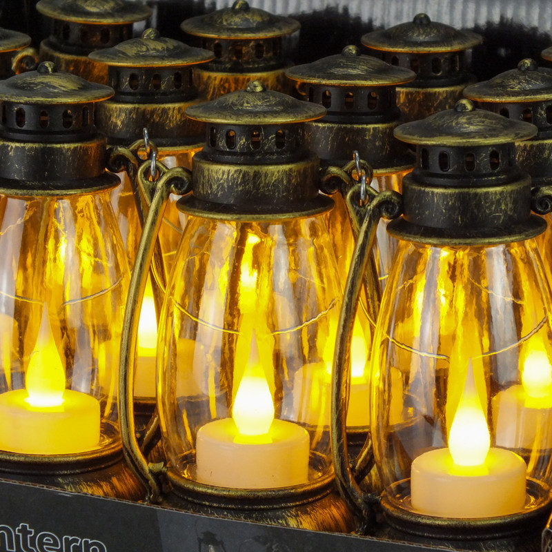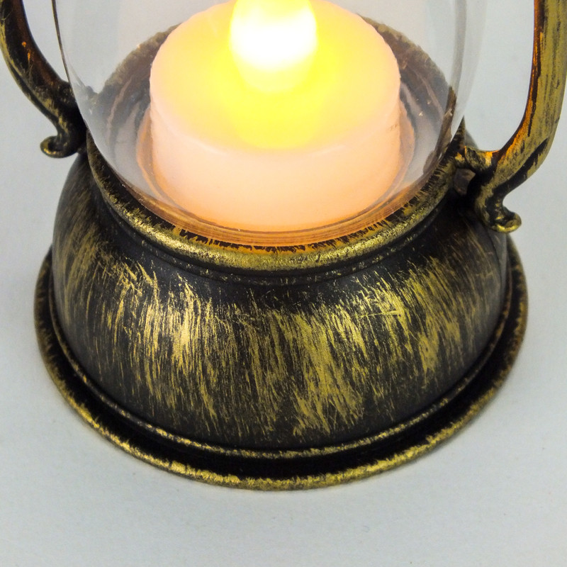 Koptatott fém hatású, műanyag világító elemes lámpás. A lámpás használható önmagában, vagy koszorúkra és díszekre, kegyeleti dekorációkhoz. Akasztó füllel ellátott, és teljesen ellenáll az időjárási viszontagságoknak. A lámpásokban az elem tartozékként megtalálható.