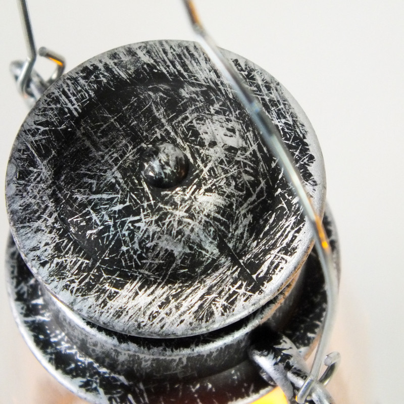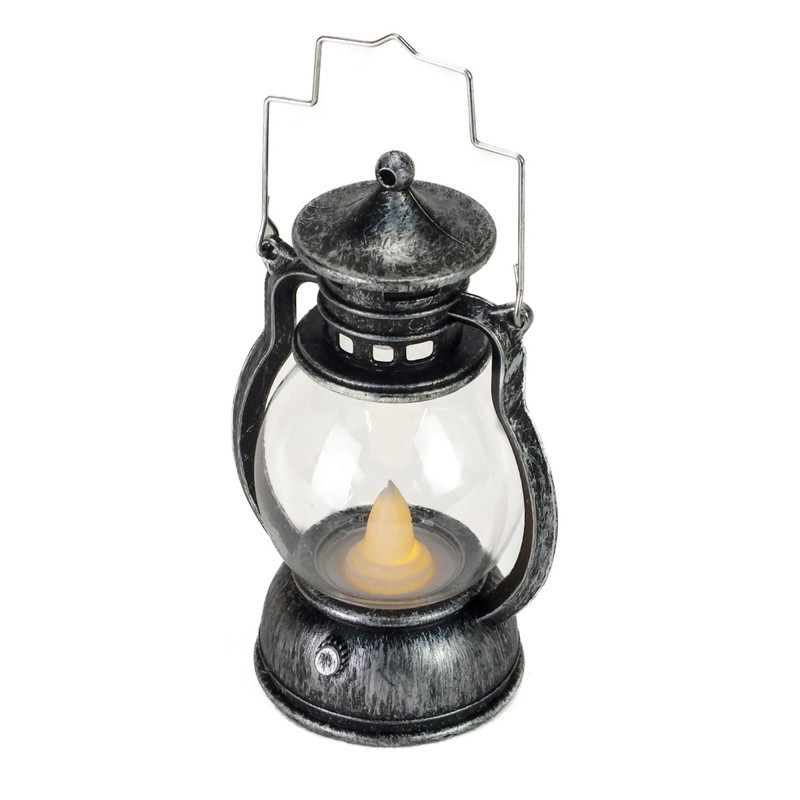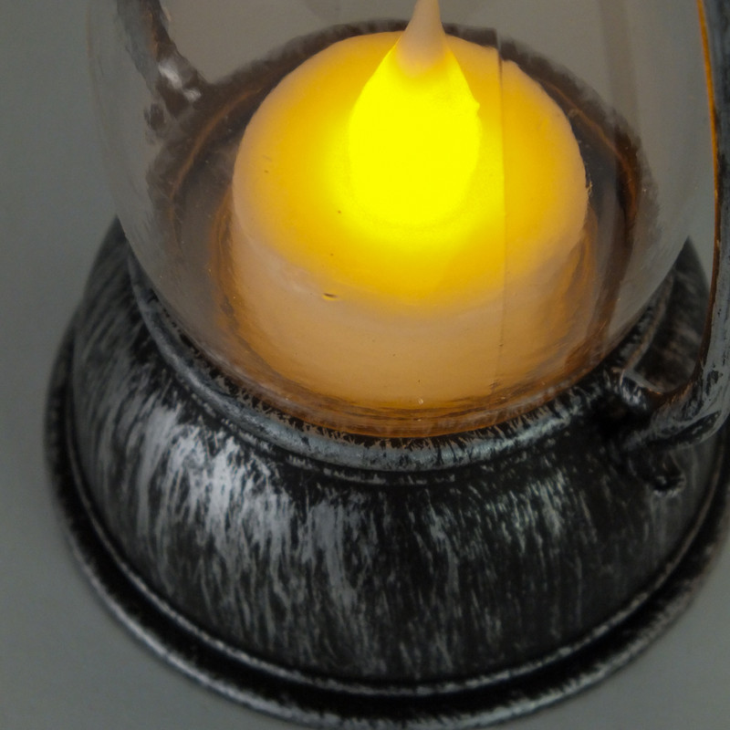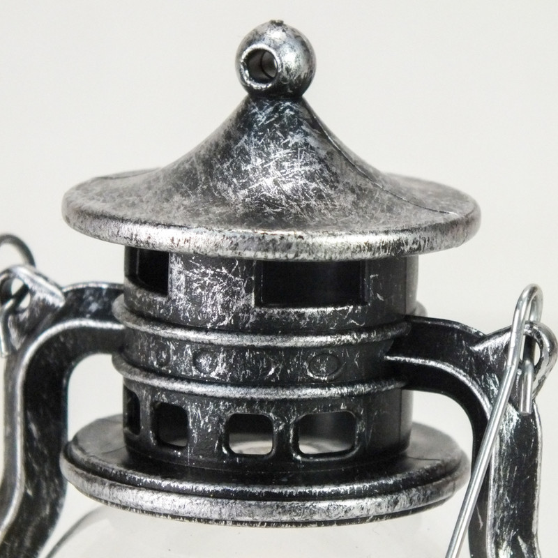 Koptatott fém hatású, műanyag világító elemes lámpás. A lámpás használható önmagában, vagy koszorúkra és díszekre, kegyeleti dekorációkhoz. Akasztó füllel ellátott, és teljesen ellenáll az időjárási viszontagságoknak. A lámpásokban az elem tartozékként megtalálható.