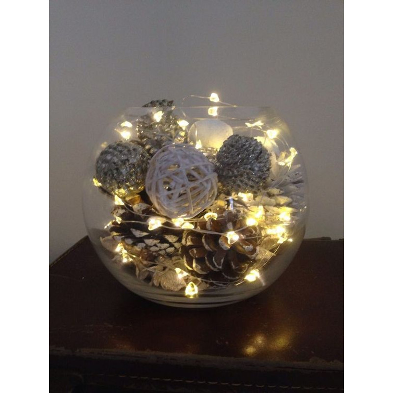 Tölts meg egy mély tálalót vagy kosarat narancsokkal, diókkal és almákkal, majd helyezd el közöttük a LED-füzért. A természetes anyagok és a fények kombinációja rusztikus, de mégis modern hatást kelt.