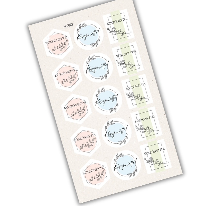 A Matrica - Köszönettel pasztell matricák 15db/lap saját gyártású termék, amely finom pasztell színeivel elegáns és visszafogott megjelenést biztosít. A lapon található 15 darab matrica ideális ajándékcsomagoláshoz, borítékok, dobozok és tasakok lezárásához, valamint csokrok csomagolásához is tökéletes választás. Letisztult stílusa miatt kiválóan használható köszönőajándékokhoz, ünnepi alkalmakra vagy kézműves termékek dekorálására. Könnyen felragasztható, praktikus és esztétikus megoldás minden alkalomra.