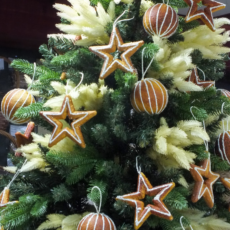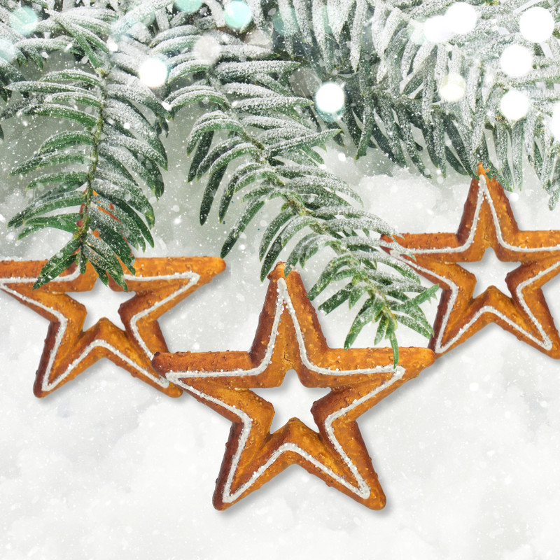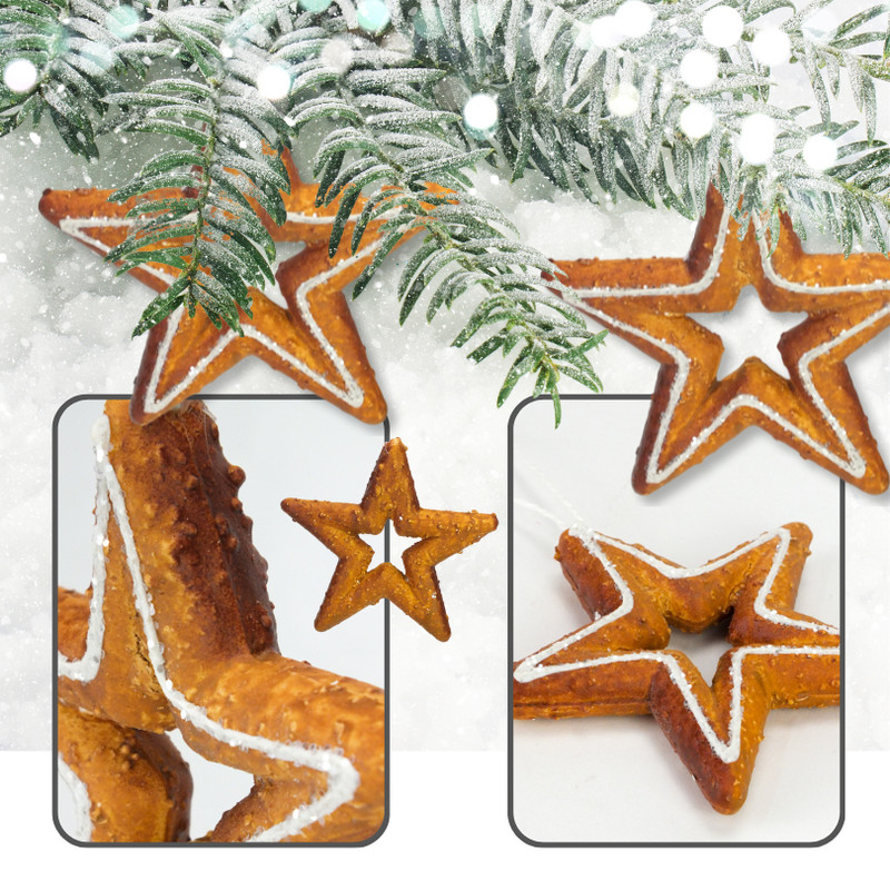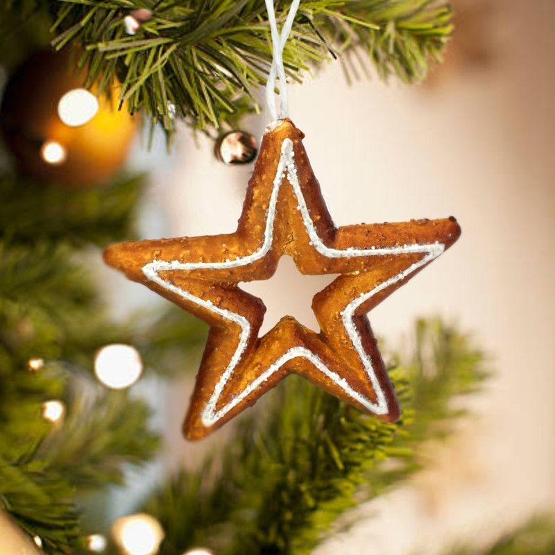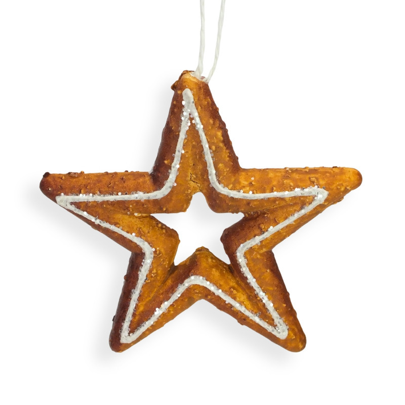 Csillag alakú lyukas mézeskalács karácsonyfadísz, akasztóval ellátva.