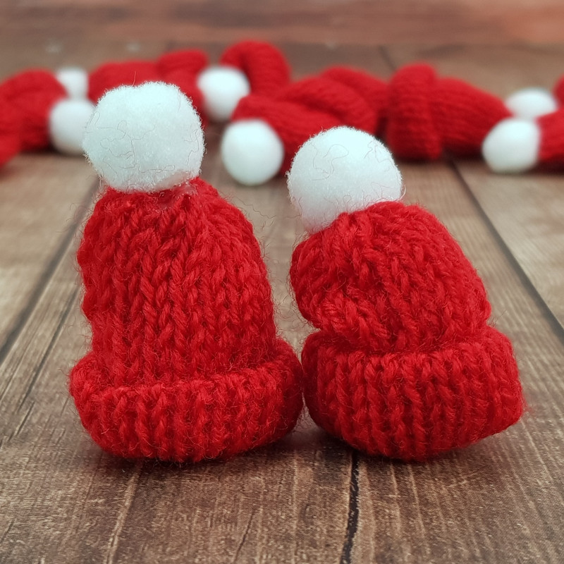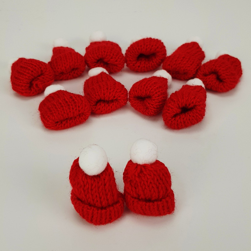 Aprócska kötött sapkák, pompom ladbával a tetején. Karácsonyi, téli dekorációkhoz, készítményekhez. Pl.: karácsonyfadísz, asztalidísz vagy falidísz kiegészítőnek.