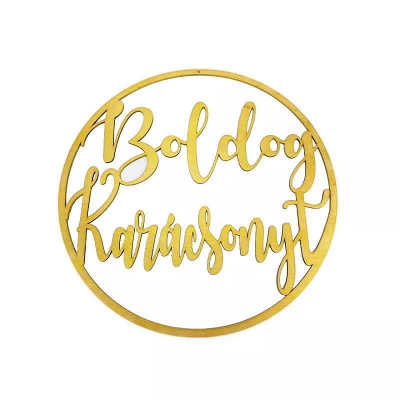 Lézervágott arany színűre festett óriás karika dekoráció, "Boldog Karácsonyt" felirattal. Önmagában is mutatós, de többféle kiegészítővel egyszerűen feldobhatjuk: masnival, szalagokkal, mini figurákkal és tobozzal, karácsonyi termésekkel stb. Használható ajtódísznek, otthoni beltéri dekorációként, ablakba vagy kirakatokba.