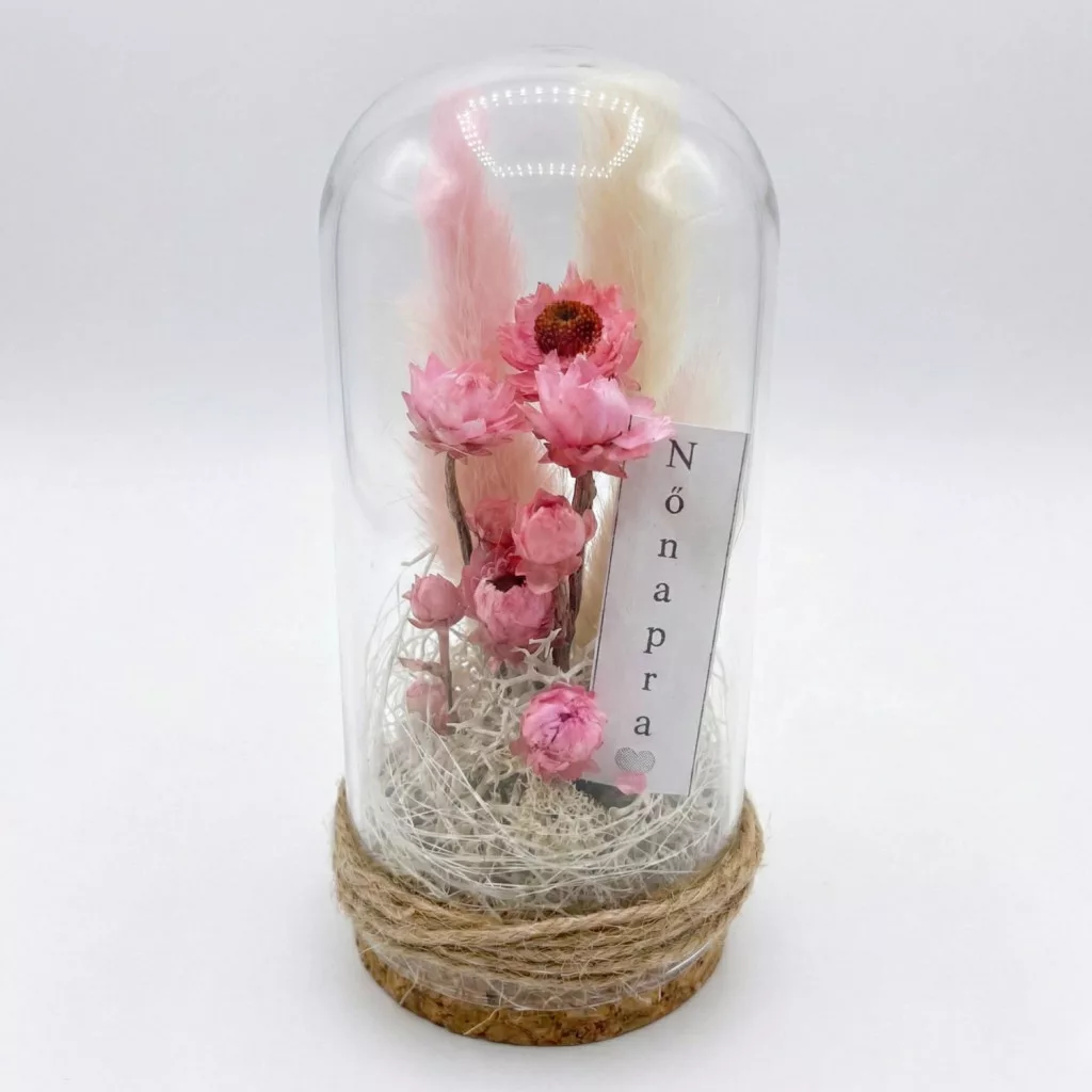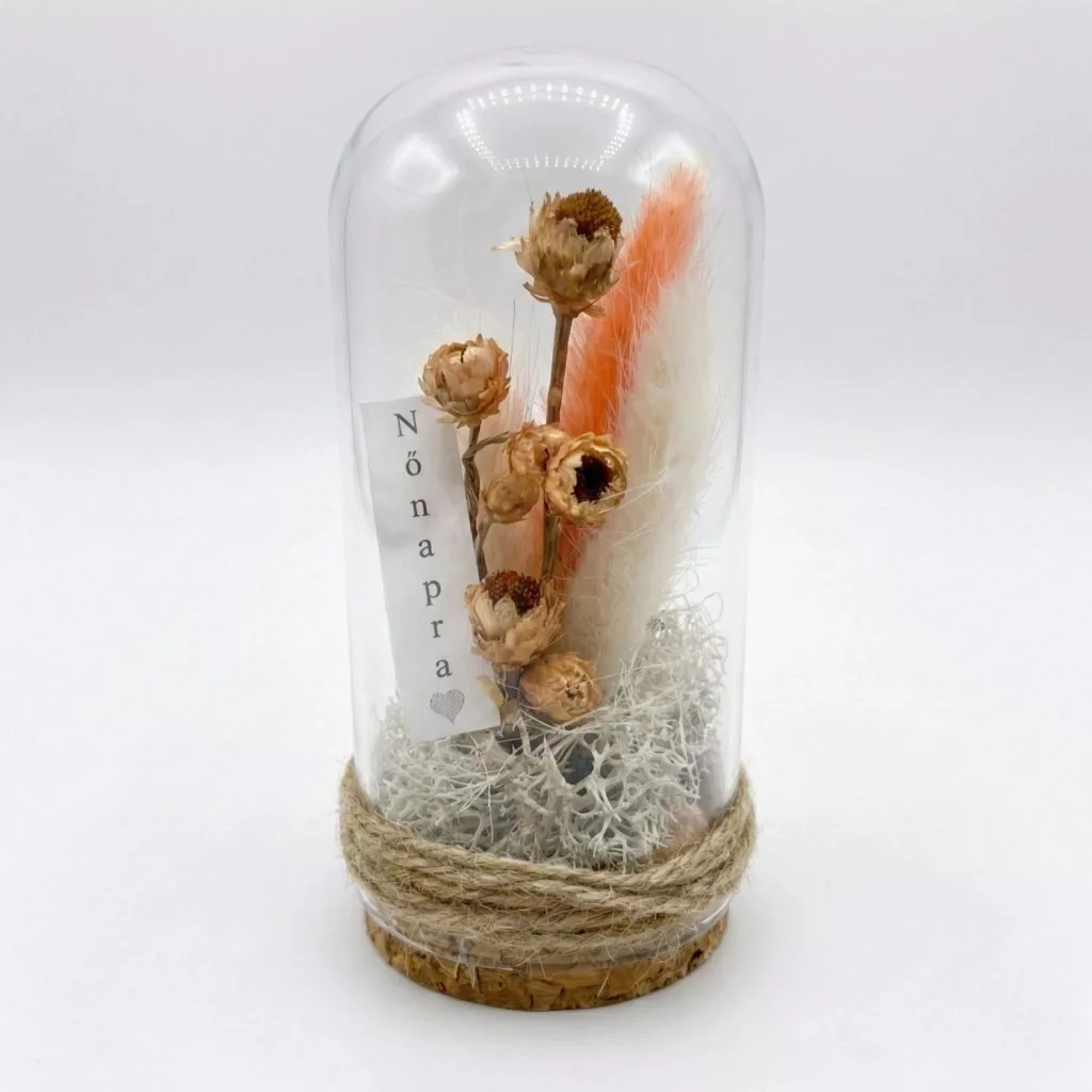 Az üvegbúra megvédi a kompozíciót, a parafa talp természetes hatást ad, a „Nőnapra” felirat pedig azonnal személyessé teszi.
