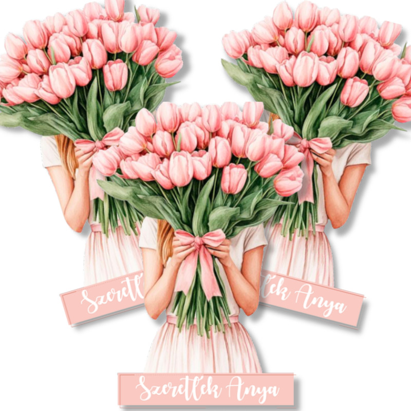 Ez a nyomtatott dekorkarton csomag három darab Tulipános lány dekorációt tartalmaz, „Szeretlek Anya” felirattal kiegészítve. Saját gyártású termék, amely tökéletes választás anyák napi dekorációhoz, ajándékkísérőkhöz vagy bármilyen otthoni kreatív összeállításhoz. Könnyű anyaga miatt egyszerűen rögzíthető, és jól kombinálható más tavaszi dekorációs elemekkel.