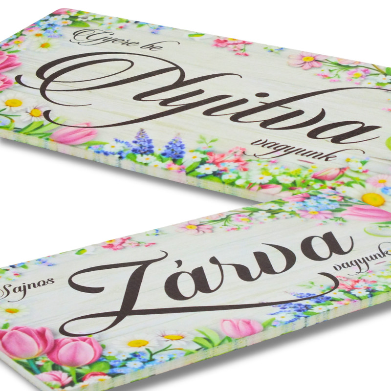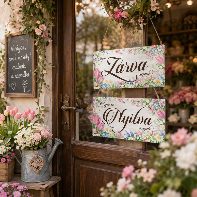 Ez a saját gyártású nyomtatott fa tábla Zárva-Nyitva felirattal és rózsaszín tulipános mintával készült, így praktikus és dekoratív kiegészítő üzletek, műhelyek vagy szolgáltató helyiségek ajtajára. A kétoldalas használat lehetővé teszi, hogy egyszerűen jelezd a nyitvatartást, miközben a virágos grafika barátságos, esztétikus megjelenést ad a bejáratnak. A gondosan nyomtatott felület szép, egységes hatást biztosít, a 24,3 x 13 cm-es méret pedig jól látható és könnyen elhelyezhető ajtón, falon vagy kirakatban is.