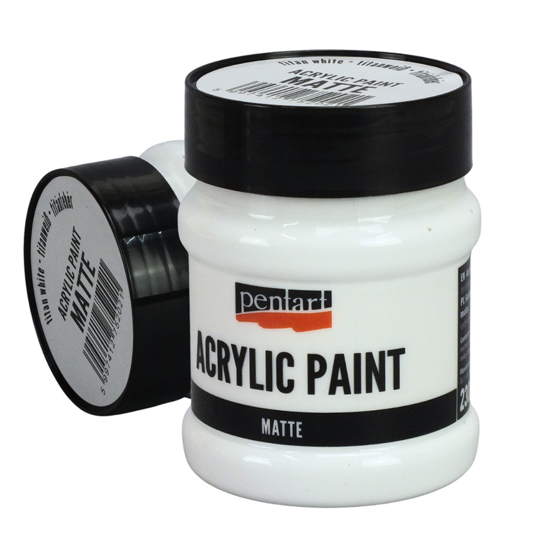 A PC Matt akrilfesték 230 ml Titánfehér matt, vízbázisú akrilfesték, amely kiváló fedőképességgel rendelkezik. Felhordható ecsettel, szivacsecsettel vagy spatulával; festhető vele fa, gipsz, kő, terrakotta, papír, polisztirol és más dekor-alapanyag is. Gyorsan szárad (kb. 30 perc), száradás után vízálló felületet képez, így megfelelő megkezelés után tartós dekoráció készíthető belőle. A szín erősen pigmentált, így kevés festékkel is jó fedés érhető el.