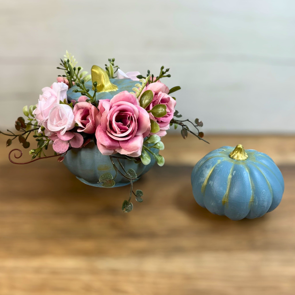 Az Őszi Romantika – Türkiz Kerámia Tök Púderrózsaszín Rózsákkal egyedülálló őszi asztaldísz, amely modern színeivel és kifinomult virágkompozíciójával azonnal magára vonja a tekintetet. Készítsd el Te is csináld magad csomagunkkal.