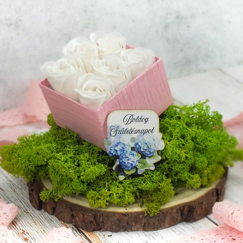 Ez a szappanrózsás ajándékdoboz egyedi, elegáns és illatos meglepetés, amely biztosan mosolyt csal az ajándékozott arcára!