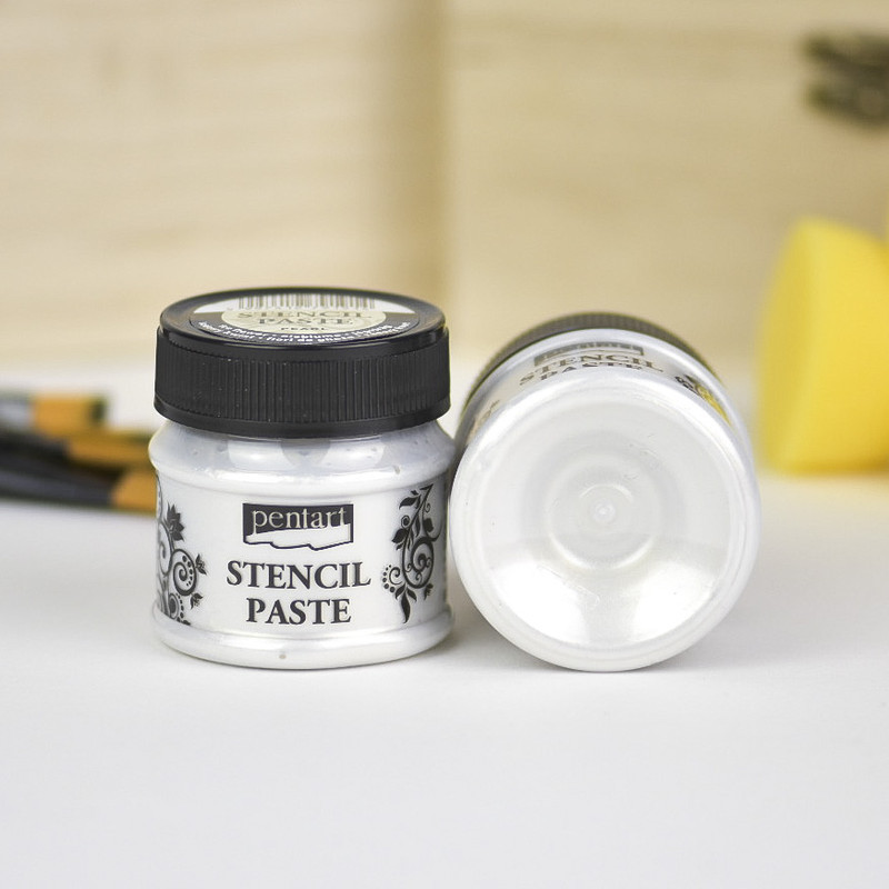 Stencilező paszta - Selyem finomszemcsés, sűrű paszta, mely kiváló stencilezéshez, 3Dhatású díszítéshez. Használat előtt alaposan felkeverendő! Vízbázisú, fagyveszélyes.