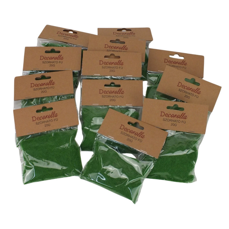 A sötétzöld szórható fű makettekhez, kirakatokhoz szánt füves felület kialakítására való kiegészítő. Ragasztóval kombinálható.