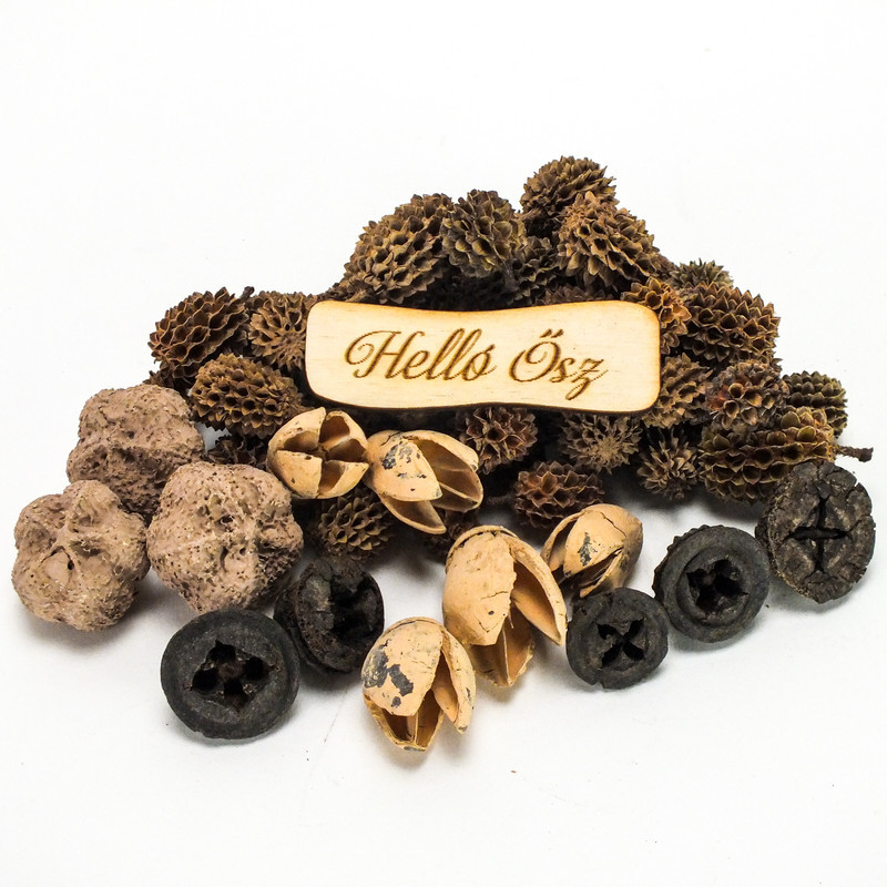 A terméscsomag a sok kicsi sokra megy tökéletes példája, ha természetes és egyedi dekorációra vágysz, ez remek választás. A terméscsomag kiegészíti a meglévő díszítő elemeket, kitölti az üres tereket de önmagában is mutatós dekorációt képez.
