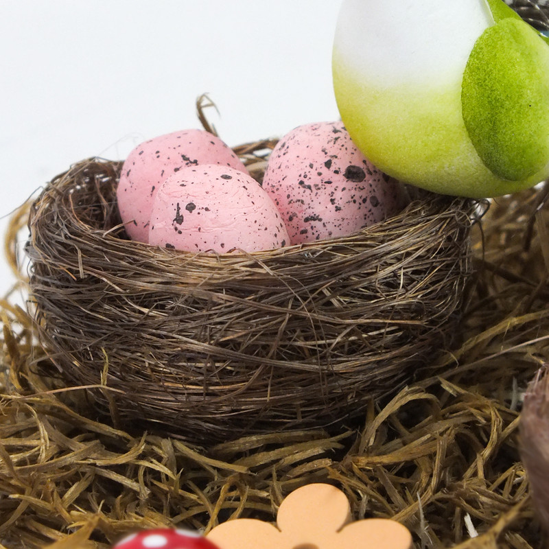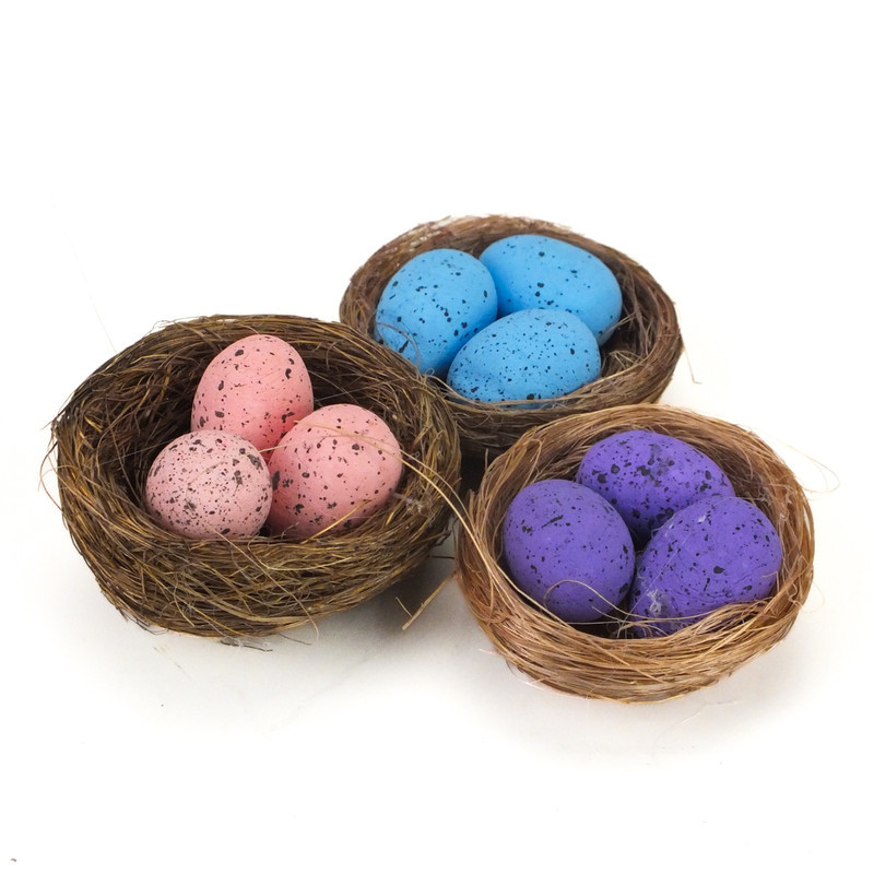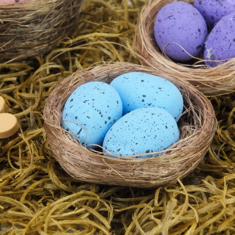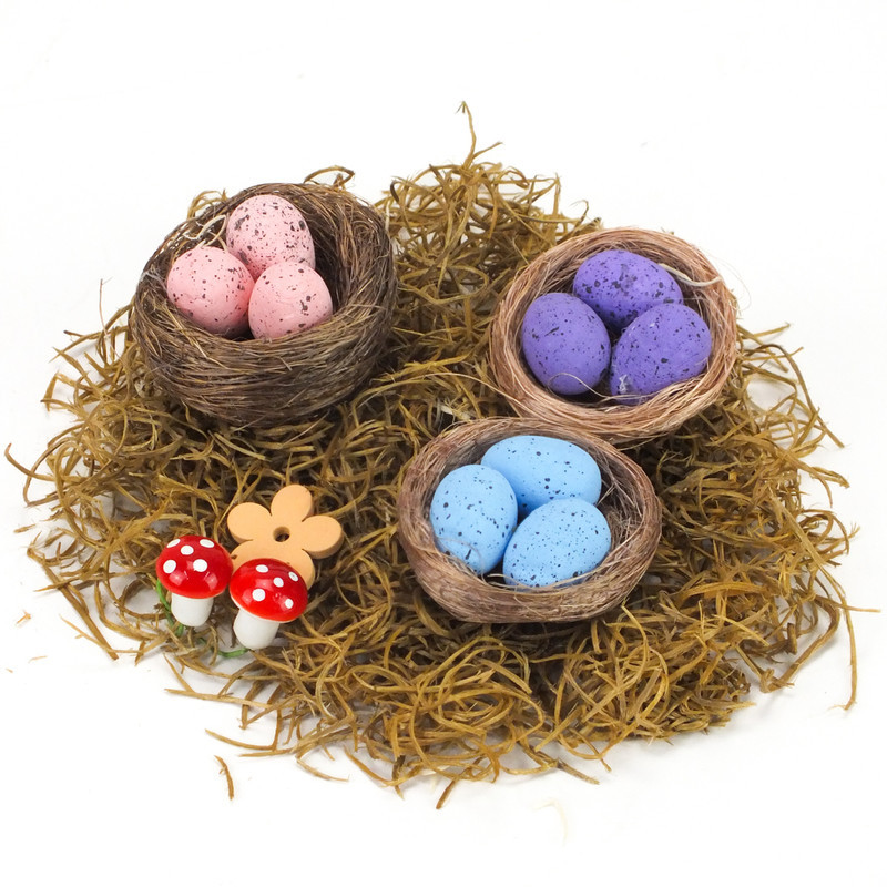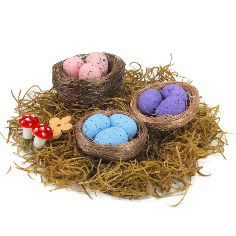 3db fészek dekoráció mini tojásokkal. Húsvétra illetve a tavaszi-nyári időszak kreatív alkotóinak díszeibe illeszthető kiegészítő.
