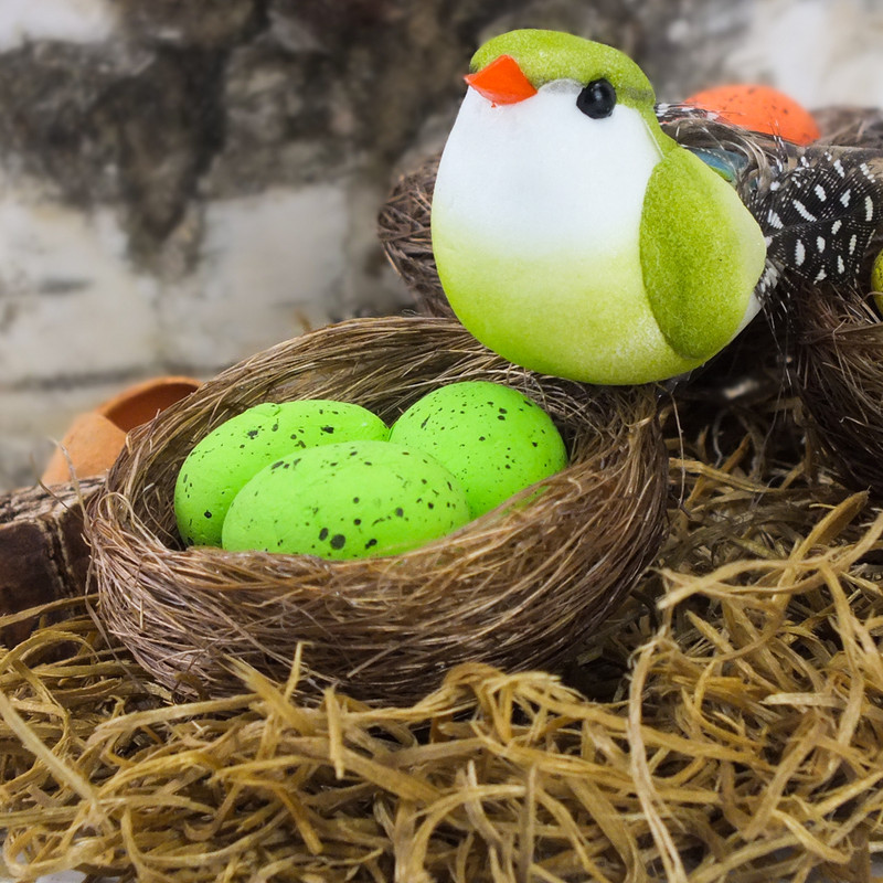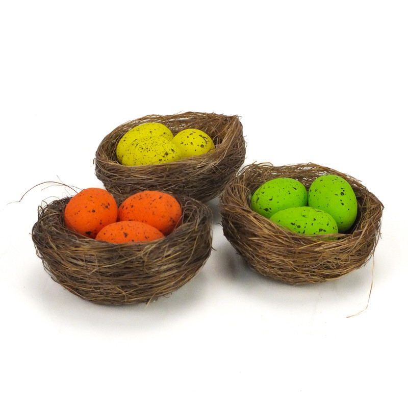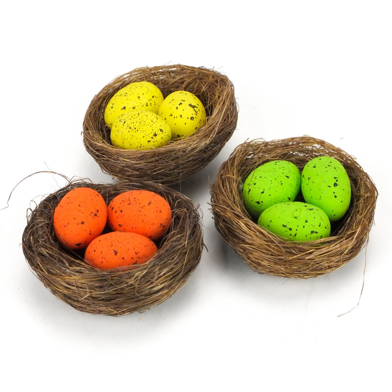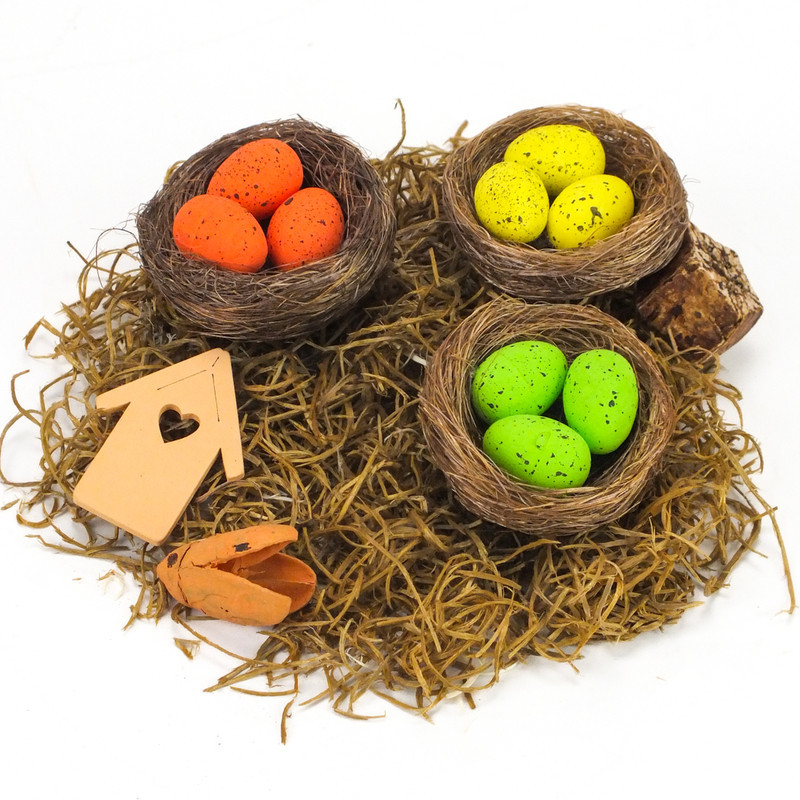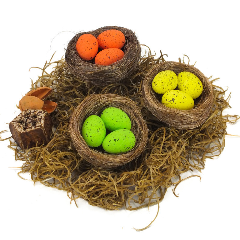 3db fészek dekoráció mini tojásokkal. Húsvétra illetve a tavaszi-nyári időszak kreatív alkotóinak díszeibe illeszthető kiegészítő.