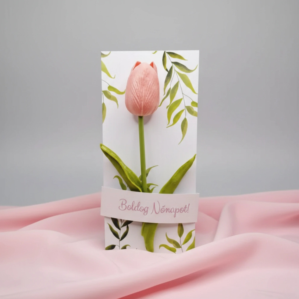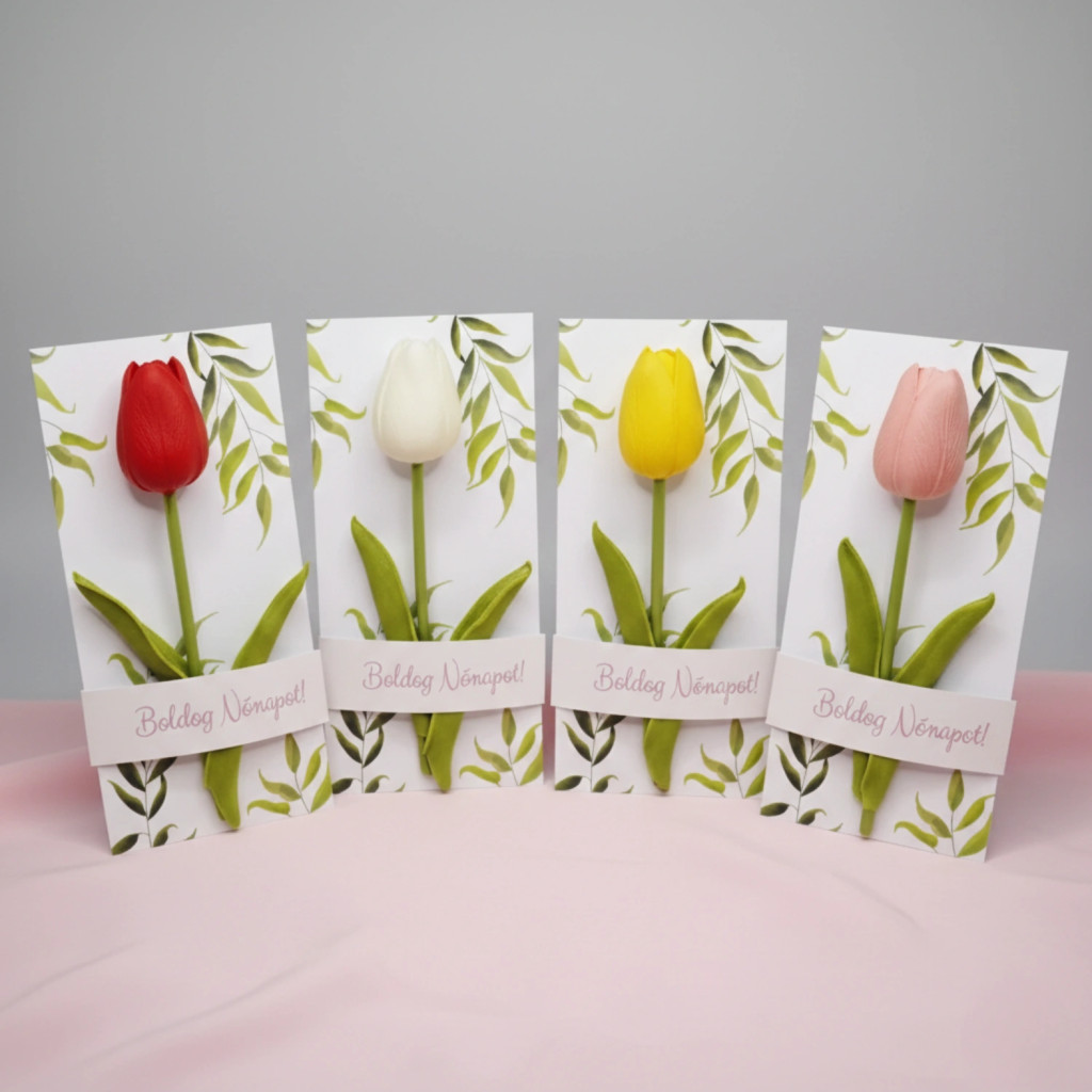 Ünnepelje meg a nők napját az általunk kínált nőnapi köszöntő kártyával, amely egy gyönyörű és élethű gumitulipánnal van díszítve.