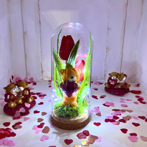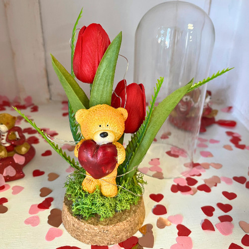 A kis mackó szeretettel ölel egy piros szívet, míg az élethű piros tulipánok eleganciát és frissességet sugároznak. Az üvegkupola belső LED-világítása pedig meghitt és romantikus hangulatot teremt, akár az esti órákban is.
