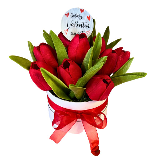 Ez a gondosan összeállított díszdoboz élethű, piros tulipánokat rejt, melyek sosem hervadnak el. A piros szalaggal díszített fehér box elegáns megjelenést kölcsönöz, a „Boldog Valentin-napot” felirat pedig még különlegesebbé teszi az ajándékot.